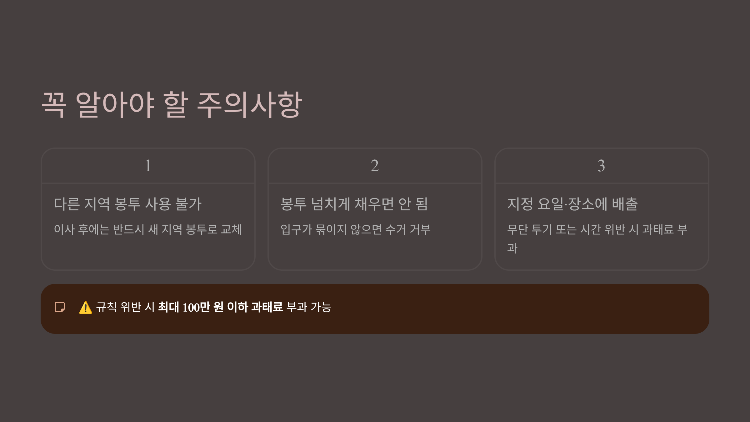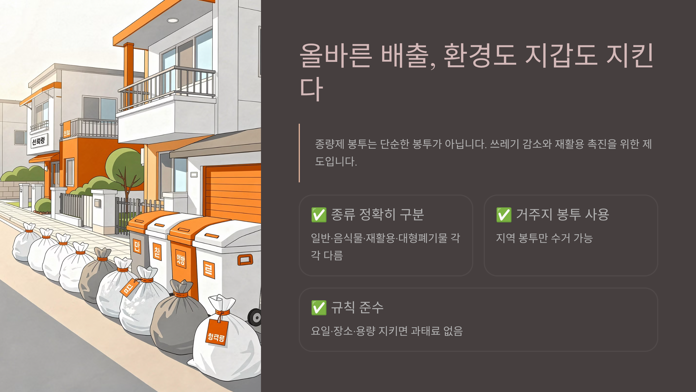 종량제 봉투는 쓰레기 양에 따라 비용을 내는 제도이며, 종류와 규칙을 정확히 지켜야 과태료 없이 올바르게 배출할 수 있다.